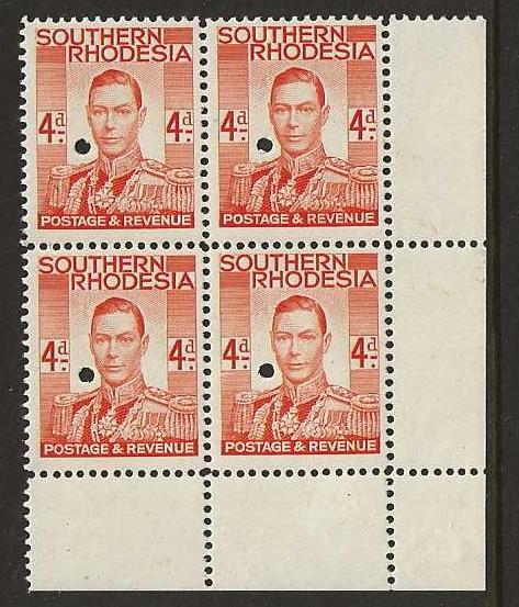 Southern Rhodesia 1937 George VI Four Pence Printers proof unmounted block of four with small punch holes unmounted mint. SG 43.
