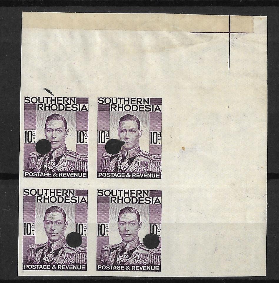 Southern Rhodesia 1937 George VI Ten Pence Imperforate plate proof block of four with punch holes. From top right of the sheet. SG 47.