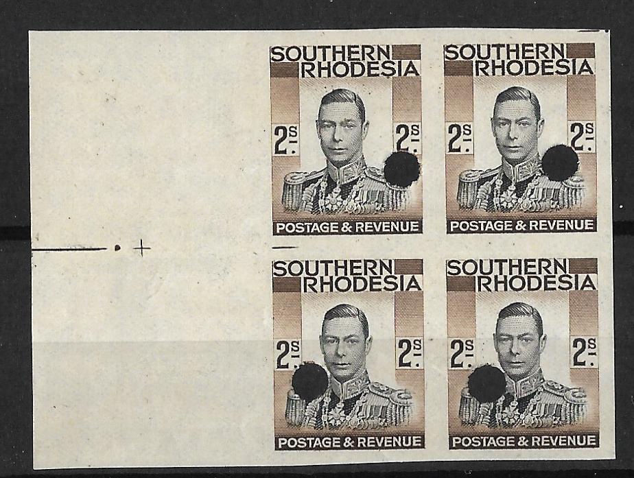 Southern Rhodesia 1937 George VI Two Shillings Imperforate plate proof block of four with punch holes. From right centre of the sheet. SG 50.