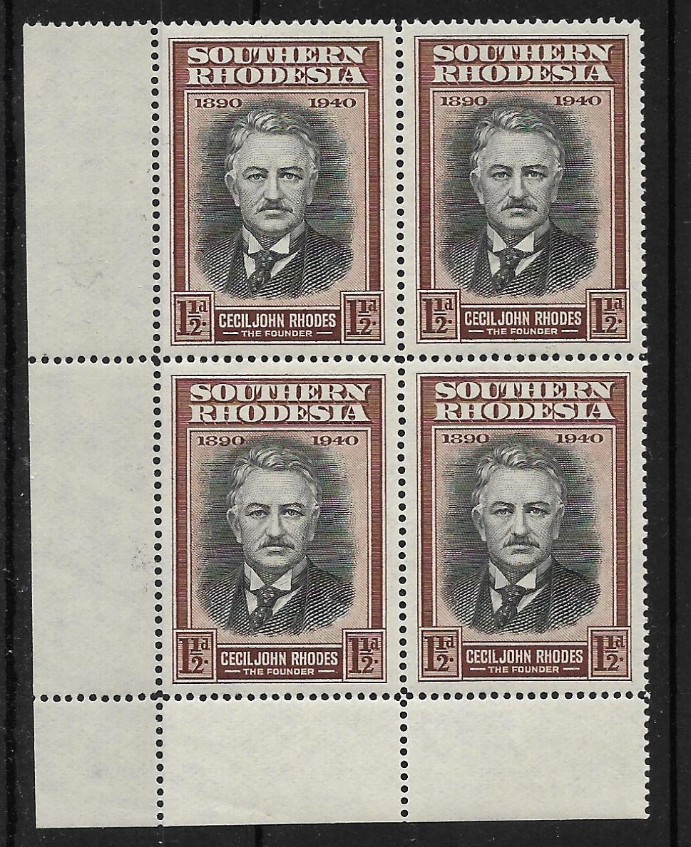 Southern Rhodesia 1940 Golden Jubilee One and Halfpence block of four with Recut flaw unmounted mint. SG 55a. Cat £28.