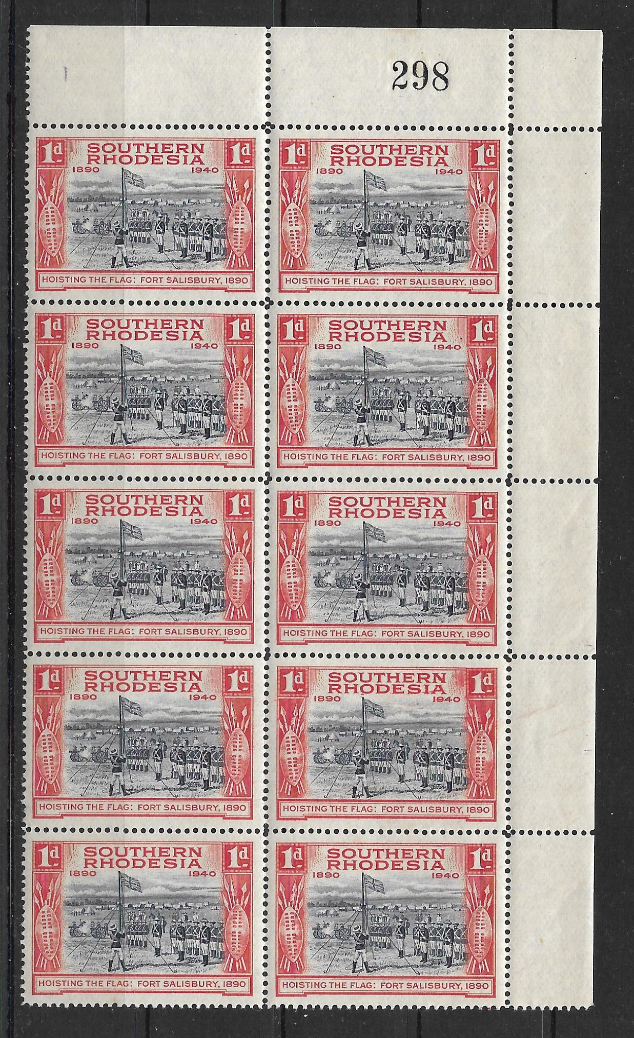 Southern Rhodesia 1940 Golden Jubilee One Penny block of ten with Q flaw, R6/4 unmounted mint. SG 54.