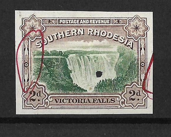 Southern Rhodesia 1941 Victoria Falls Two Pence single plate proof with complete design on gummed paper and security puncture. With red ink correcting marks indicating areas for fixing before printing. SG 35.