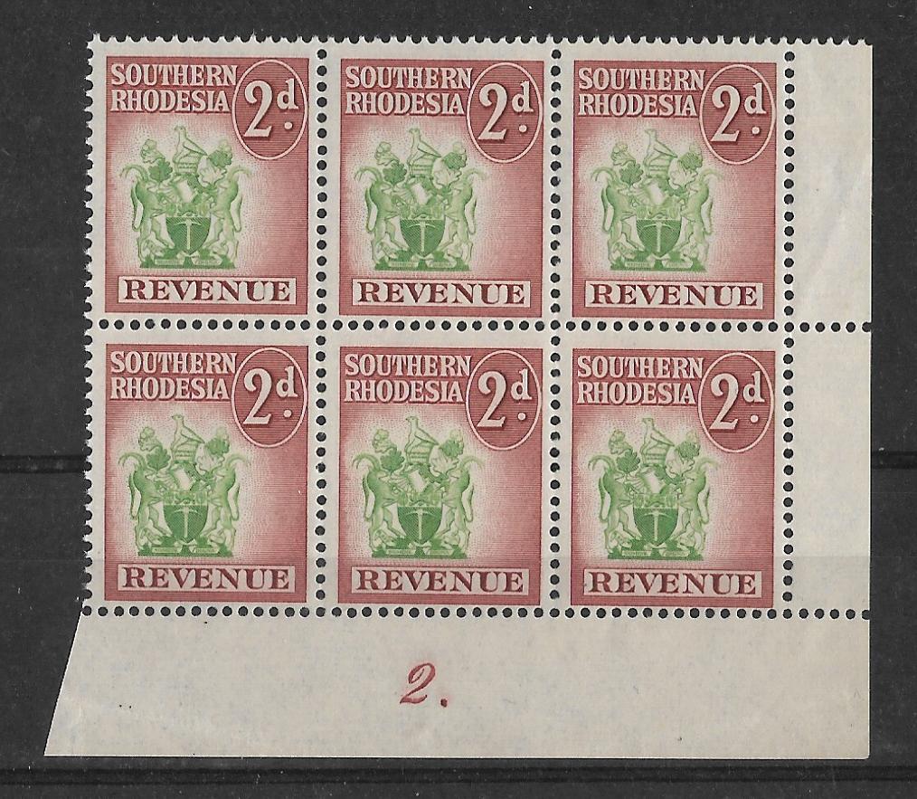 Southern Rhodesia 1953 Arms Type Revenues Two Pence Plate 2 block of six unmounted mint. Scarce.