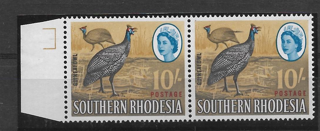 Southern Rhodesia 1964 QEII Ten Shillings marginal pair with extra tail feather unmounted mint. SG 104a. Cat £41.