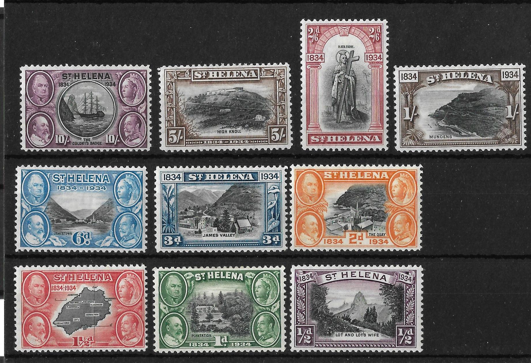 St Helena 1934 George V Centenary of British Rule set lightly mounted mint. SG 114/123. Cat £425. (Ten Shillings has one small hinge mark).
