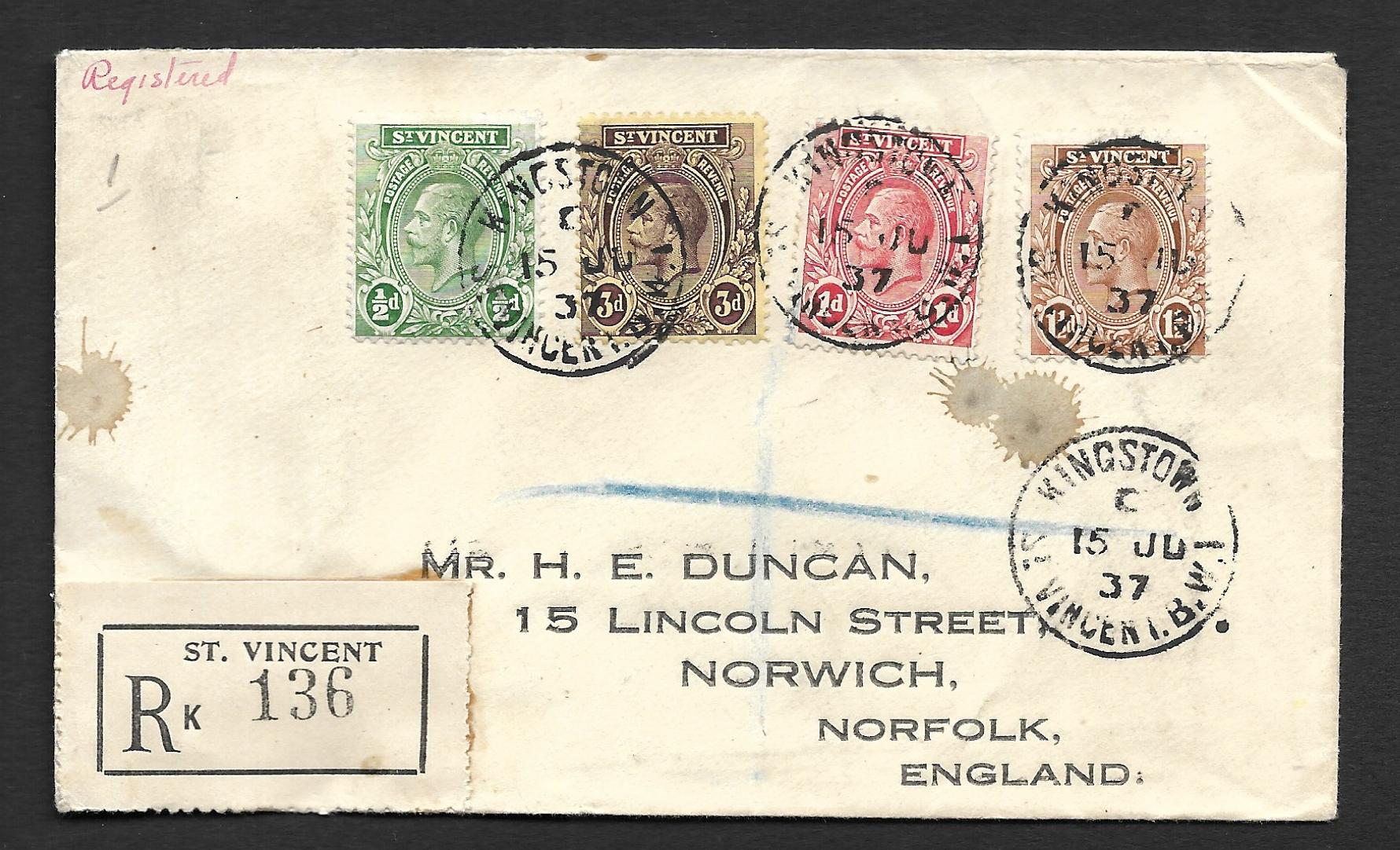 St Vincent 1937 George V Registered cover to England. One Shilling Four and a Halfpence rate used.