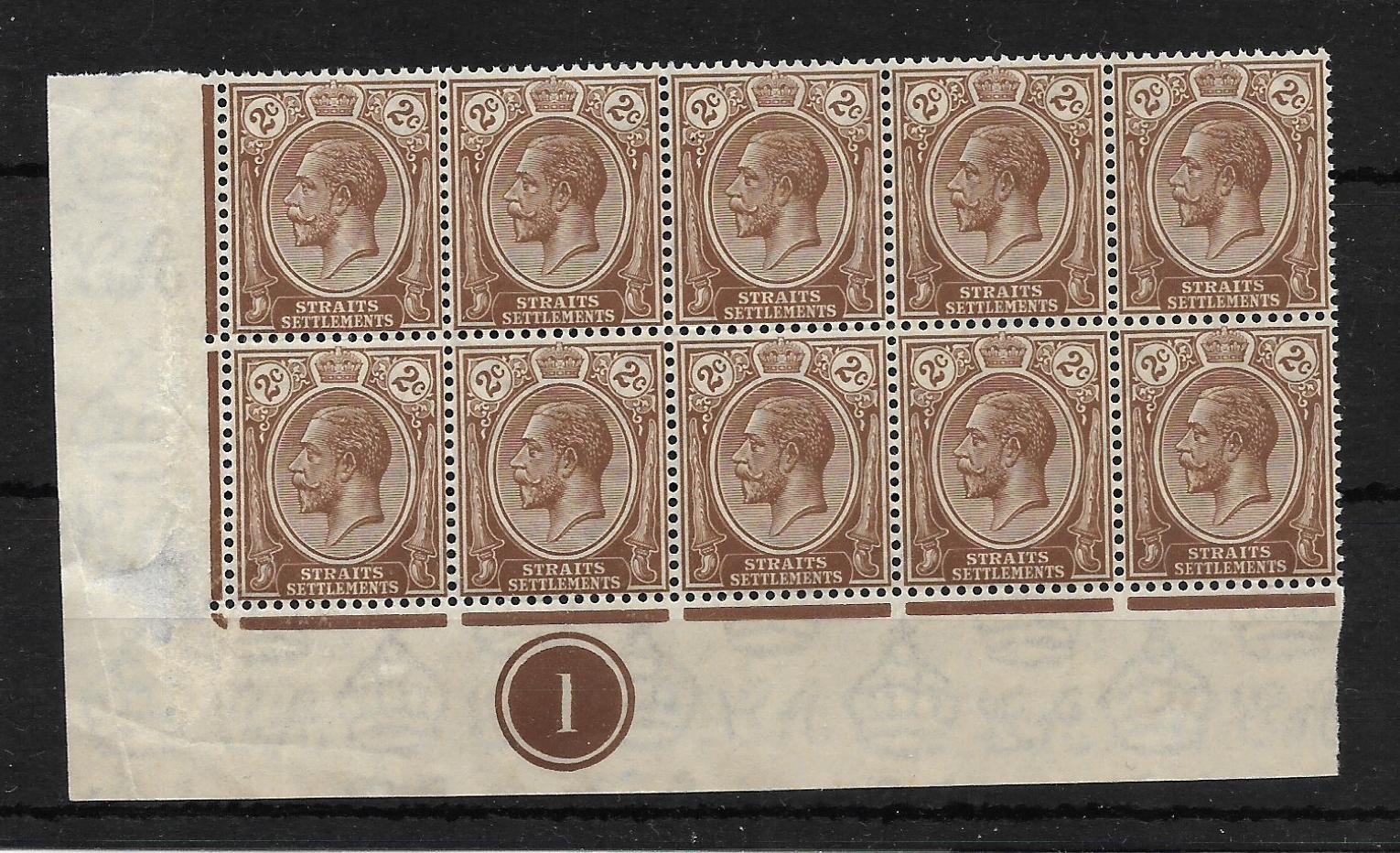 Straits Settlements 1921 George V Two Cents Plate 1 block of ten unmounted mint. Some perf separation between stamp 1 and 2 only. SG 220. Cat £75+.