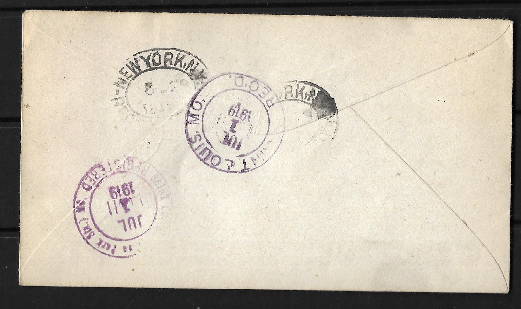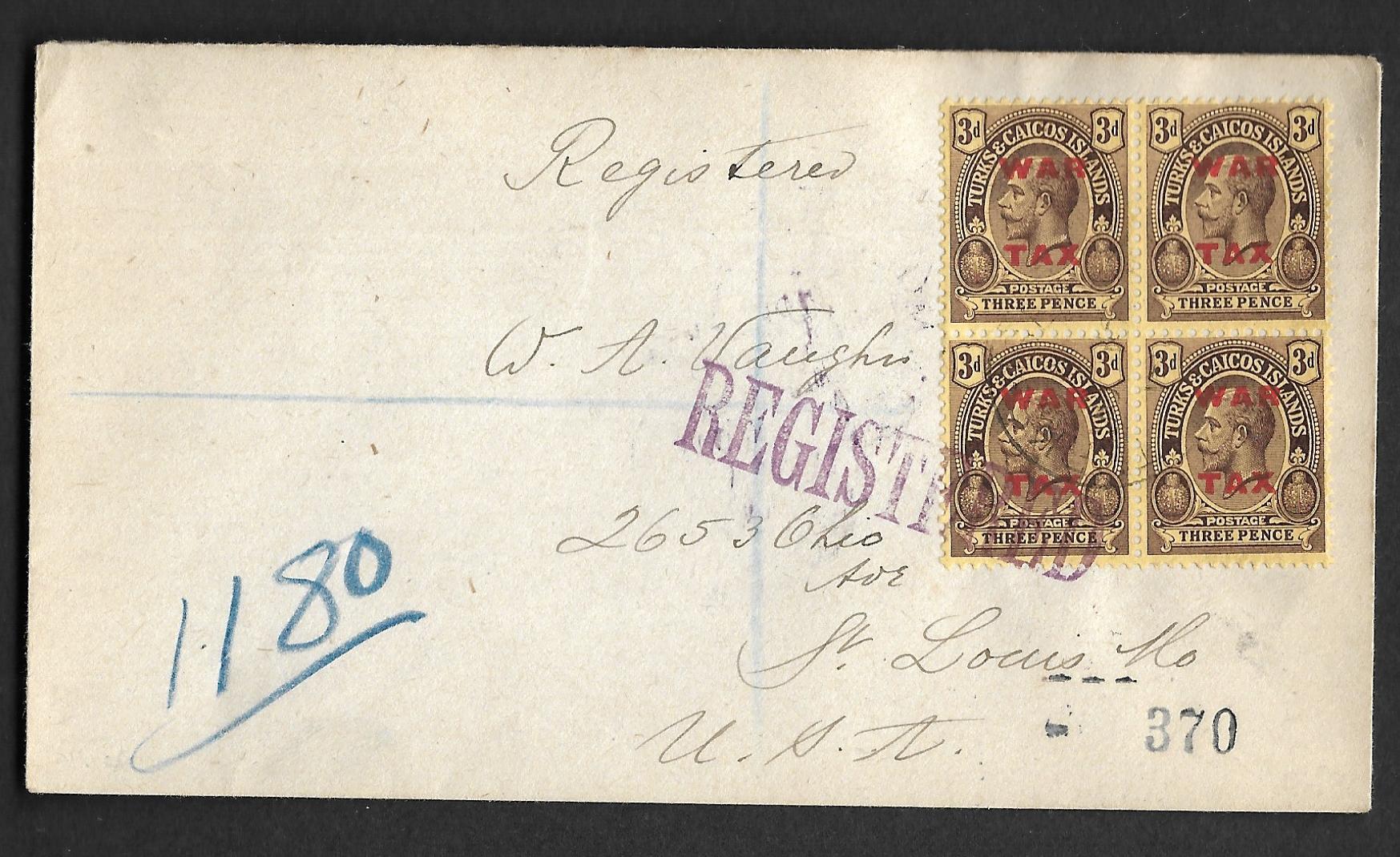 Turks & Caicos Islands 1919 War Tax registered cover to USA. Has receiving marks on rear. Stamps Cat £12 each.