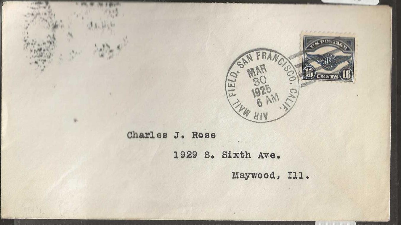 United States 1925 Flight cover from San Francisco to Maywood with Sixteen Cents Airmail stamp used.