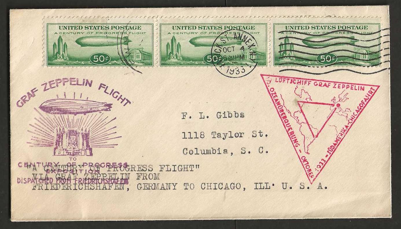 United States 1933 Graff Zeppelin cover from United States with Three Fifty Cents Zeppelin stamps