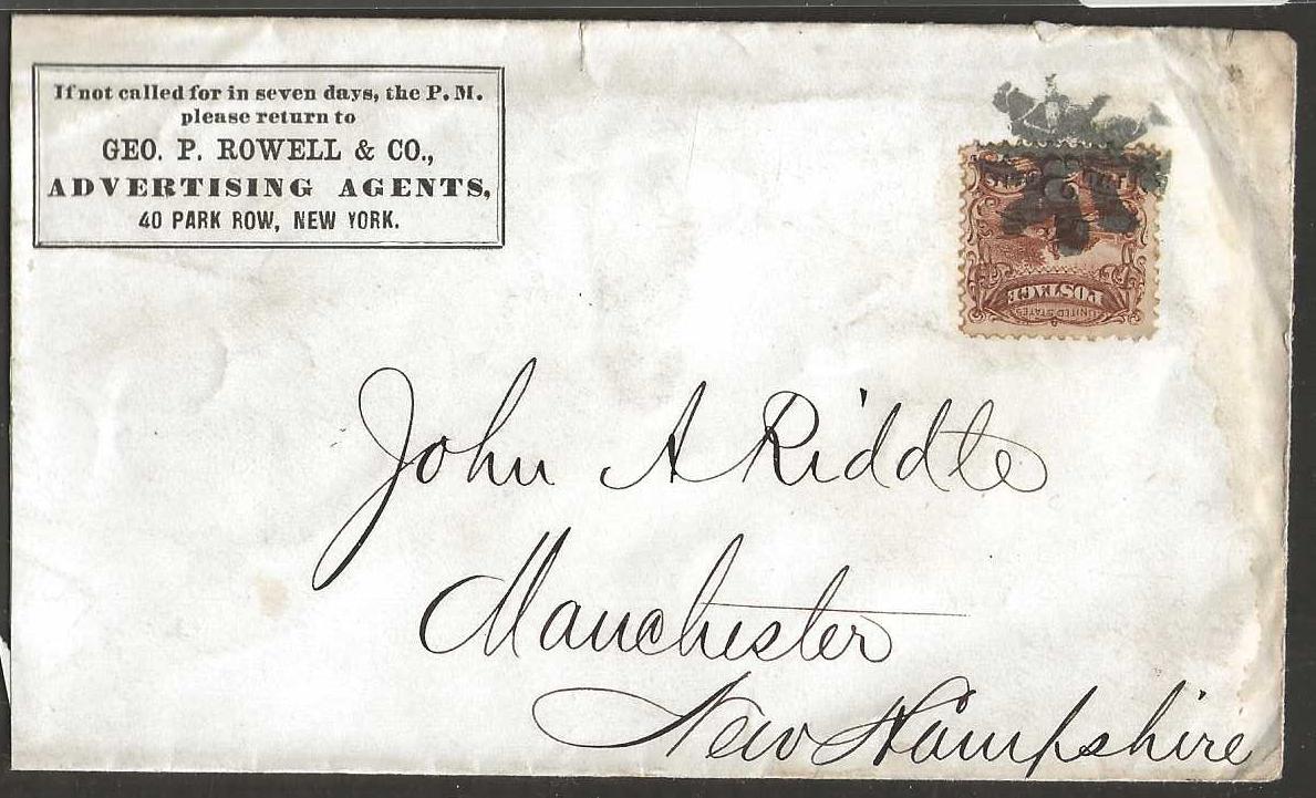 United States Two Cents used on an Advertising cover to New Hampshire. No markings on back, missing the back flap.
